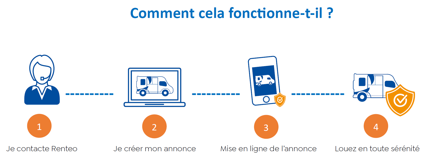 Louez votre camion ou votre van en toute sérénité grâce à Renteo. Vous serez informés par email ou SMS de toutes les locations à venir. Lorsqu'un client réserve votre camion en ligne, il effectue le paiement à l'avance de manière sécurisée directement sur le site. L'état des lieux de départ et d'arrivée se fait facilement via une application fournie. Prenez des photos, remplissez les informations requises et vous recevrez votre contrat signé en quelques minutes. Ce contrat vous permet de sécuriser toutes vos locations.
